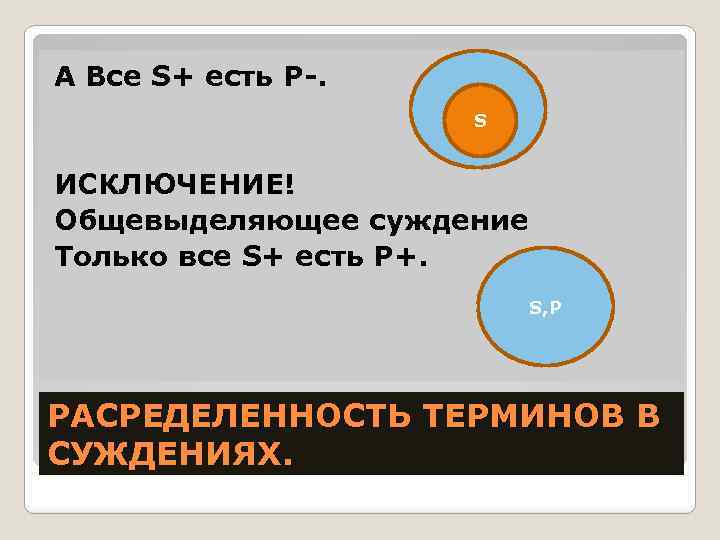 А Все S+ есть Р-. Р S ИСКЛЮЧЕНИЕ! Общевыделяющее суждение Только все S+ есть Р+. S, Р РАСРЕДЕЛЕННОСТЬ ТЕРМИНОВ В СУЖДЕНИЯХ.