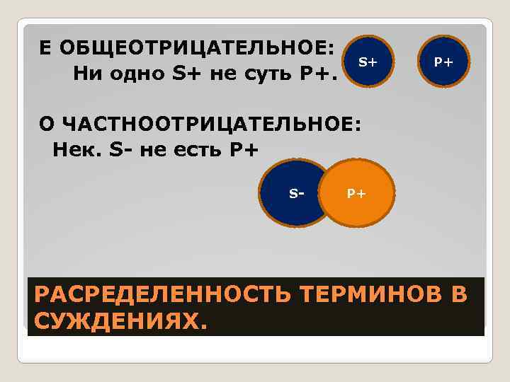 Е ОБЩЕОТРИЦАТЕЛЬНОЕ: Ни одно S+ не суть Р+. S+ Р+ О ЧАСТНООТРИЦАТЕЛЬНОЕ: Нек. S- не есть Р+ S- Р+ РАСРЕДЕЛЕННОСТЬ ТЕРМИНОВ В СУЖДЕНИЯХ.