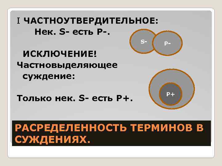 I ЧАСТНОУТВЕРДИТЕЛЬНОЕ: Нек. S- есть Р-. S- Р- ИСКЛЮЧЕНИЕ! Частновыделяющее суждение: Только нек. S- есть Р+. SР+ РАСРЕДЕЛЕННОСТЬ ТЕРМИНОВ В СУЖДЕНИЯХ.