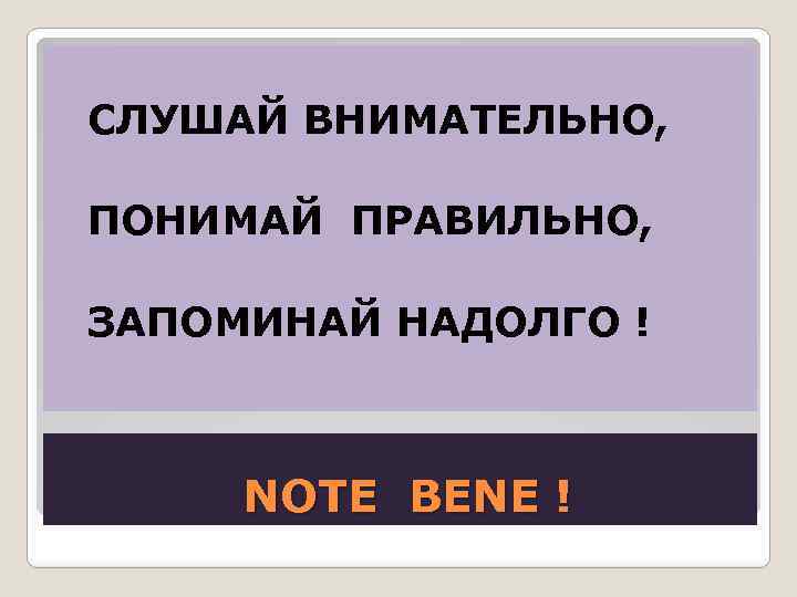 СЛУШАЙ ВНИМАТЕЛЬНО, ПОНИМАЙ ПРАВИЛЬНО, ЗАПОМИНАЙ НАДОЛГО ! NOTE BENE !
