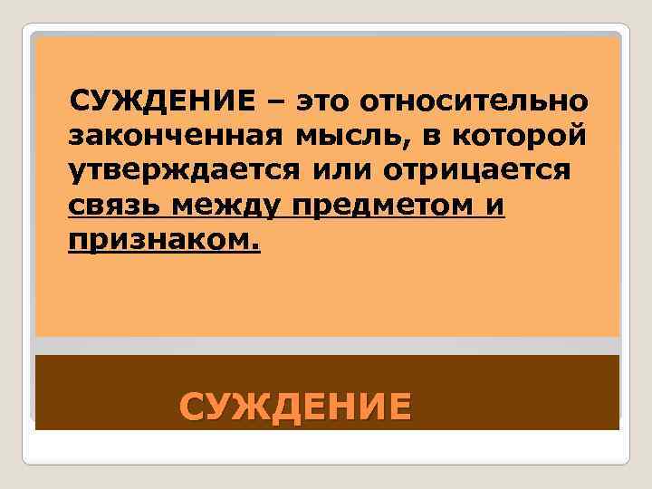 СУЖДЕНИЕ – это относительно законченная мысль, в которой утверждается или отрицается связь между предметом и признаком. СУЖДЕНИЕ