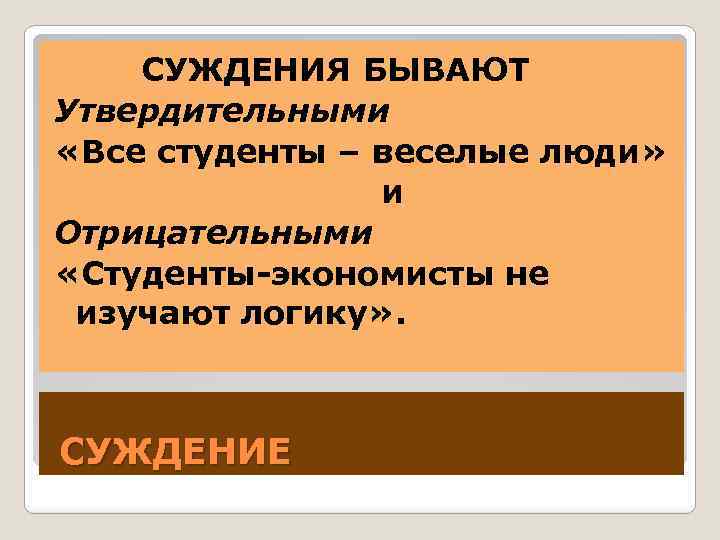 СУЖДЕНИЯ БЫВАЮТ Утвердительными «Все студенты – веселые люди» и Отрицательными «Студенты-экономисты не изучают логику» . СУЖДЕНИЕ
