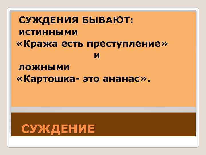 СУЖДЕНИЯ БЫВАЮТ: истинными «Кража есть преступление» и ложными «Картошка- это ананас» . СУЖДЕНИЕ