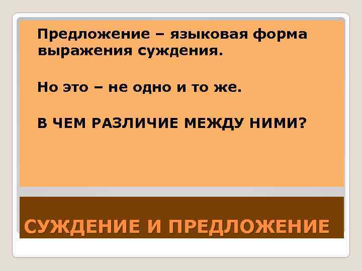 Предложение – языковая форма выражения суждения. Но это – не одно и то же. В ЧЕМ РАЗЛИЧИЕ МЕЖДУ НИМИ? СУЖДЕНИЕ И ПРЕДЛОЖЕНИЕ