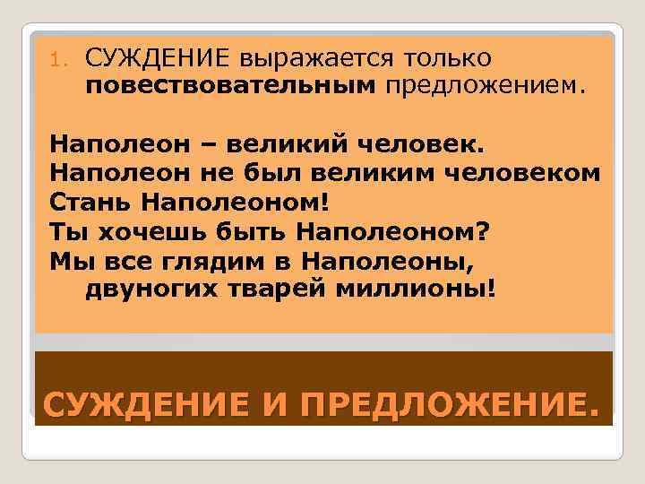 1. СУЖДЕНИЕ выражается только повествовательным предложением. Наполеон – великий человек. Наполеон не был великим человеком Стань Наполеоном! Ты хочешь быть Наполеоном? Мы все глядим в Наполеоны, двуногих тварей миллионы! СУЖДЕНИЕ И ПРЕДЛОЖЕНИЕ.