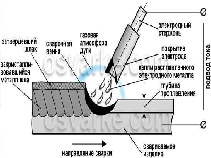 Выделяющееся тепло (в том числе за счёт теплового излучения из плазмы) нагревает торец электрода и оплавляет свариваемые поверхности, что приводит к образованию сварочной ванны — объёма жидкого металла. В процессе остывания и кристаллизации сварочной ванны образуется сварное соединение. Основными разновидностями электродуговой сварки являются: ручная дуговая сварка, сварка неплавящимся электродом, сварка под флюсом, электрошлаковая сварка. • Достоинства способа сварки неплавящимся электродом: Высокая устойчивость дуги независимо от рода (полярности) тока; Возможно получение металла шва с долей участия основного металла от 0 до 100%; Изменяя скорость подачи и угол наклона, профиль, марку присадочной проволоки можно регулировать химический состав металла шва и геометрические параметры сварного шва.
