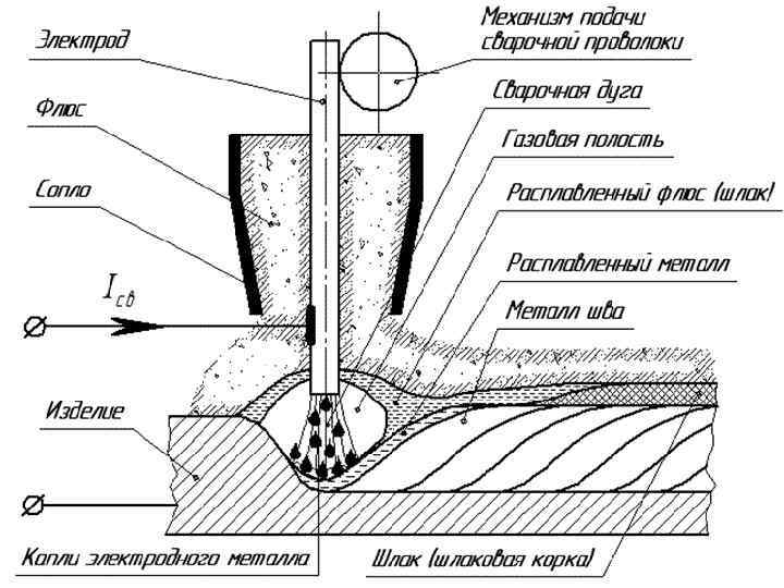 Сварка под флюсом • В англоязычной иностранной литературе именуется как SAW. В этом виде сварки конец электрода (в виде металлической проволоки или стержня) подаётся под слой флюса. Горение дуги происходит в газовом пузыре, находящемся между металлом и слоем флюса, благодаря чему улучшается защита металла от вредного воздействия атмосферы и увеличивается глубина проплавления металла.