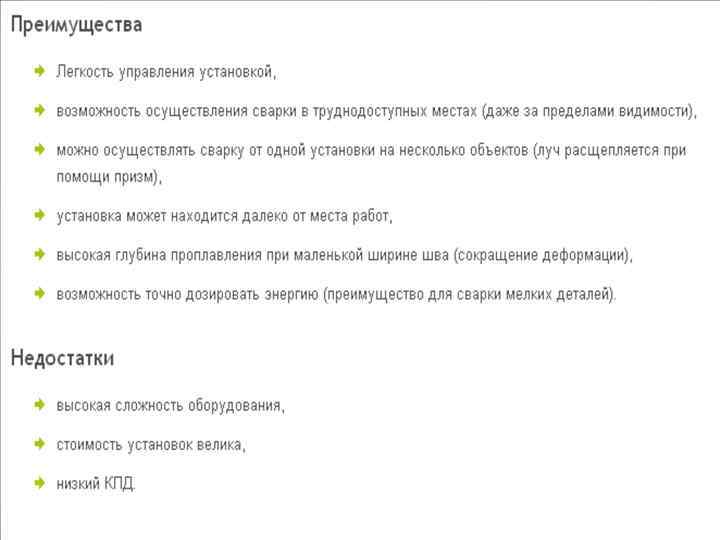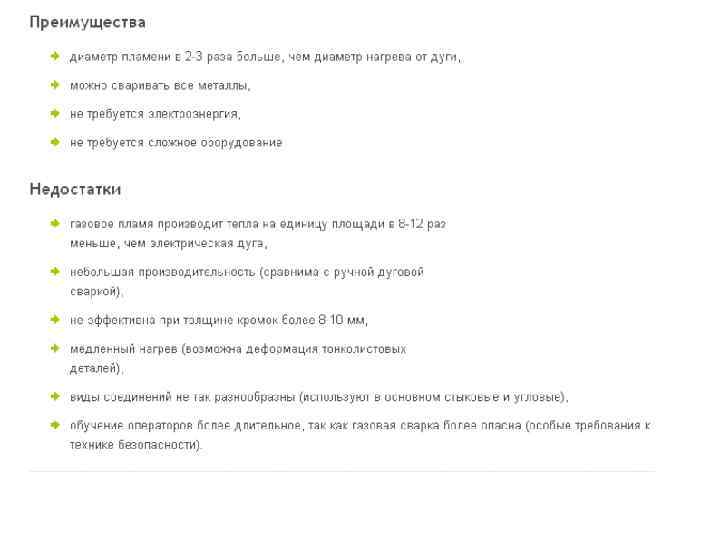 Преимущества ручной дуговой сварки • возможность сварки в любых пространственных положениях; • возможность сварки в местах с ограниченным доступом; • сравнительно быстрый переход от одного свариваемого материала к другому; • возможность сварки самых различных сталей благодаря широкому выбору выпускаемых марок электродов; • простота и транспортабельность сварочного оборудования. Недостатки ручной дуговой сварки • низкие КПД и производительность по сравнению с другими технологиями сварки; • качество соединений во многом зависит от квалификации сварщика; • вредные условия процесса сварки.