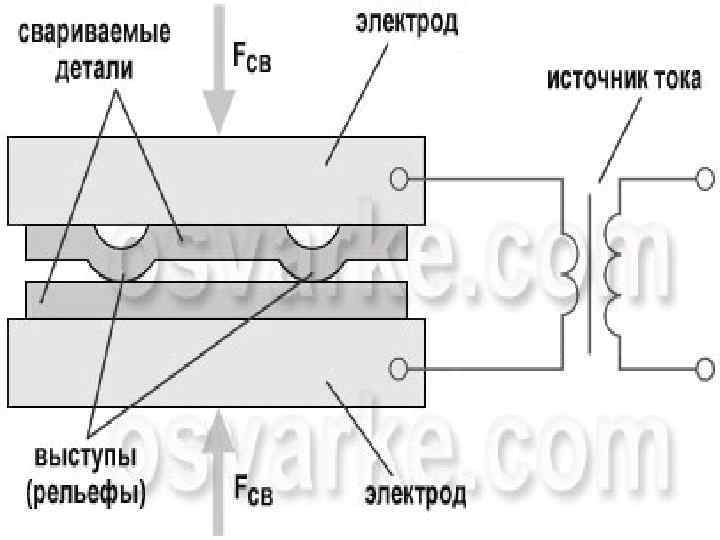 Рельефная сварка • Сущность процесса • На поверхности одной или обеих свариваемых заготовок заранее выштамповываются выступы (рельефы) круглой, кольцевой, продолговатой или другой формы. Затем детали зажимаются между электродами, обычно имеющими форму плиты, с приложением к ним усилия Fсв, и включается сварочный ток. • Металл выступа начинает интенсивно нагреваться и постепенно деформируется. На определенной стадии в месте контакта заготовок образуется зона расплавления как при точечной сварке. По мере протекания сварочного тока возрастает объем зоны расплавления, а металл выступа, деформируясь, выходит на наружную поверхность заготовки. После выключения тока расплав охлаждается и кристаллизуется с образованием ядра, окруженного уплотняющим пояском пластически деформированного металла, по которому соединение сформировалось без расплавления.