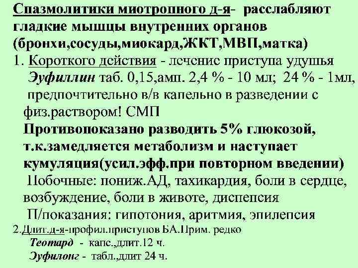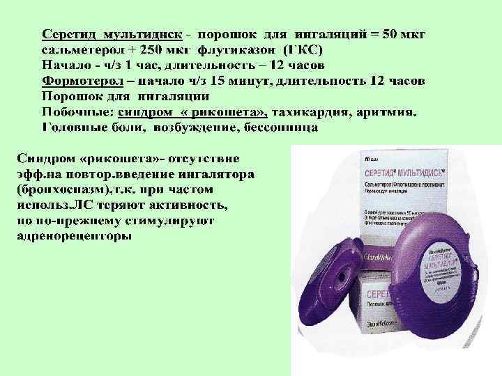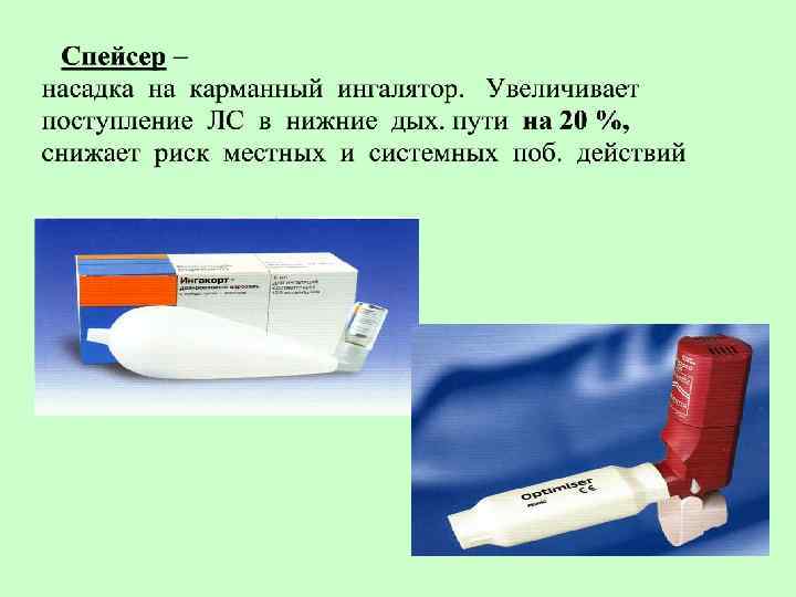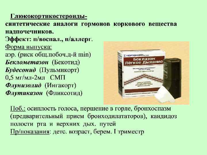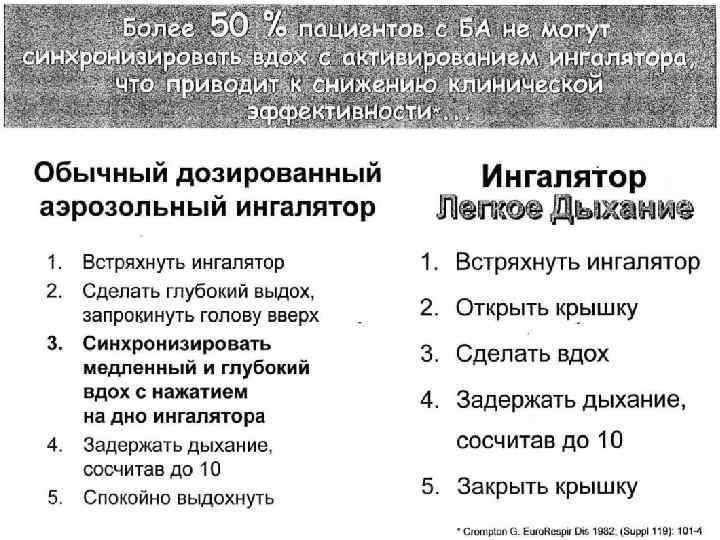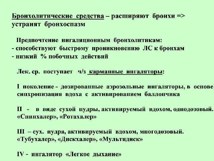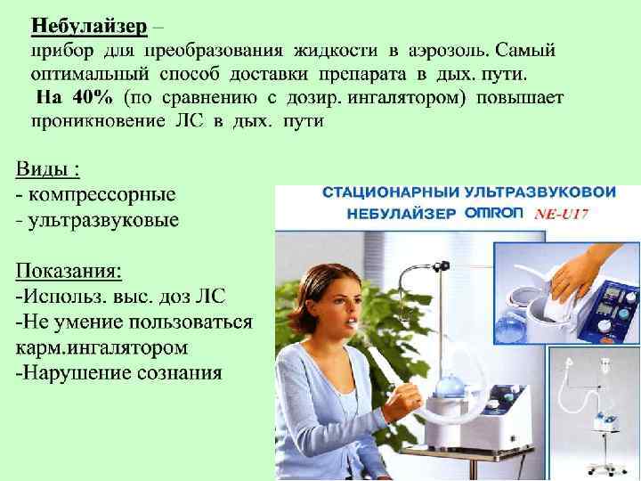 Правила применения карм. ингалятора: • • • Откашлять мокроту Встряхнуть аэрозоль Перевернуть ингалятор дном вверх Запрокинуть голову назад Сделать медленный выдох На вдохе произвести ингаляцию не поднимая язык, одновременно с нажатием на дно КИ Задержать дыхание на 10 -15 сек. Сделать выдох ч/з нос Прополоскать полость рта теплой водой При неэффективн. сделать второй вдох ч/з 1 мин При неправильном пользовании в бронхи поступает только 10% ЛС, т. к большая часть оседает в пол. рта