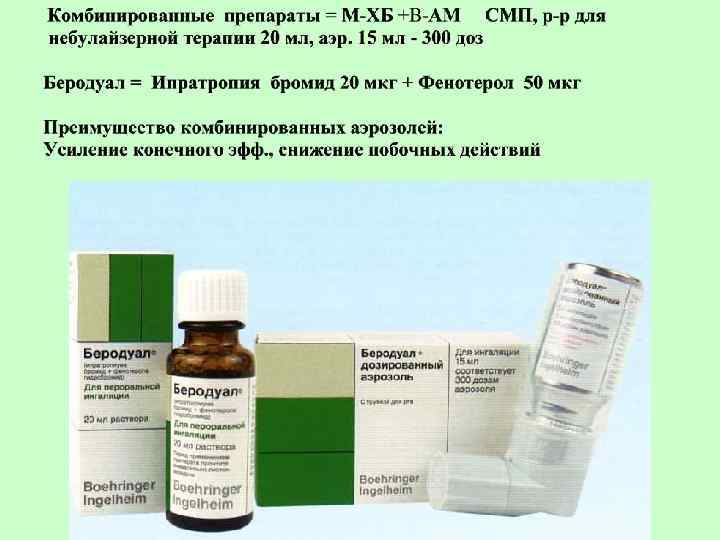 М-ХБ - блокируют М-ХР, эффекты симп. НС Лечение приступов БА. : Ипратропия бромид (Атровент) на М 1, и М 3 – холинорецептор Дозированный ингалятор, небулайзерная терапия Начало эффекта ч/з 40 мин, длительность - 6 часов Профилактика приступов БА. : Тиотропия бромид (Спирива) М 3 -ХБ. Длительность 24 часа. Капсулы, Ингалятор “Ханди Халер”