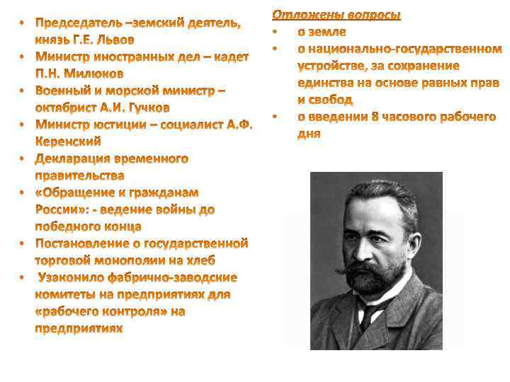Временный исполнительный комитет Государственной Думы • Неподчинившиеся царскому указу о роспуске Гос. Думы • Глава – М. В. Родзянко, представитель Гос. Думы, октябрист. «Хорошо, я решился и беру власть для восстановления государственного и общественного порядка Петроградский совет рабочих и солдатских депутатов • Председатель исполнительного комитета меньшевик Н. С Чхеидзе: «Упаси господи возглавить Временное првительство. Я не сумашедший» Заместители: • Трудовик Керенский А. Ф. • Меньшевик Скобелев М. И.