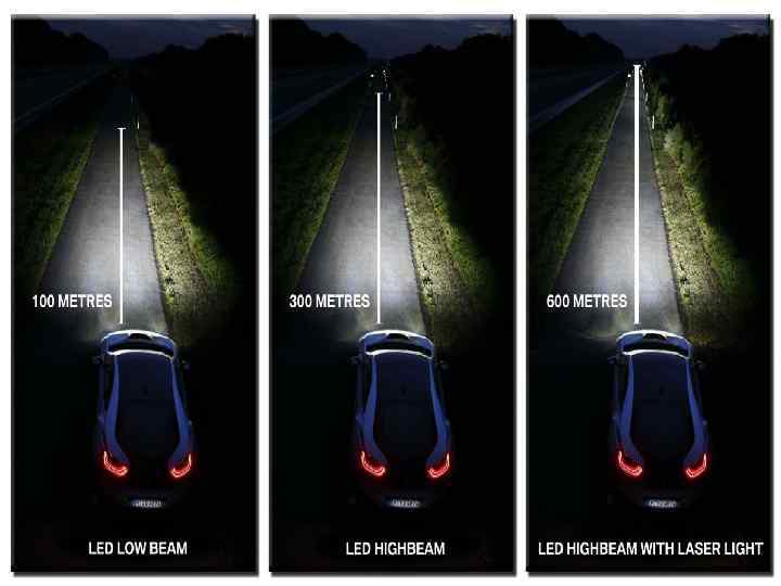 Отражательная пластина фокусирует его перед автомобилем. По утверждению разработчиков, лазерные фары намного эффективнее предшествующих им светодиодных элементов по нескольким параметрам: яркости свечения (в 1000 раз), энергопотреблению (значительно ниже), сроку службы (10000 часов работы).