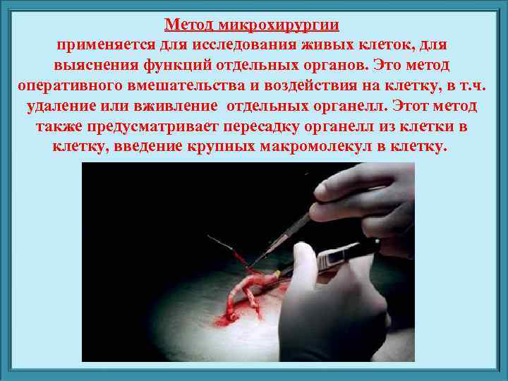 Метод микрохирургии применяется для исследования живых клеток, для выяснения функций отдельных органов. Это метод оперативного вмешательства и воздействия на клетку, в т. ч. удаление или вживление отдельных органелл. Этот метод также предусматривает пересадку органелл из клетки в клетку, введение крупных макромолекул в клетку.