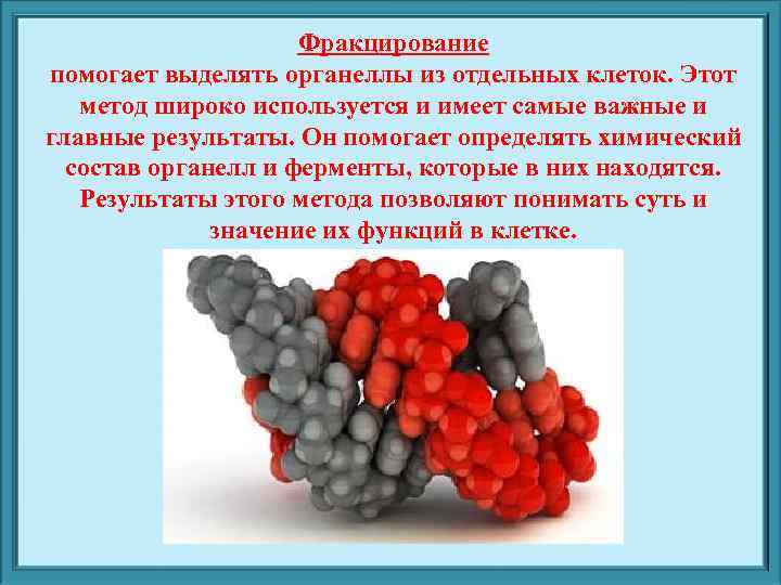 Фракцирование помогает выделять органеллы из отдельных клеток. Этот метод широко используется и имеет самые важные и главные результаты. Он помогает определять химический состав органелл и ферменты, которые в них находятся. Результаты этого метода позволяют понимать суть и значение их функций в клетке.