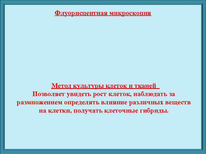 Флуорисцентная микроскопия Метод культуры клеток и тканей Позволяет увидеть рост клеток, наблюдать за размножением определять влияние различных веществ на клетки, получать клеточные гибриды.