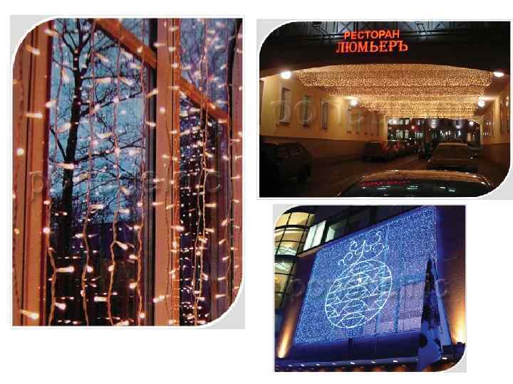 • Плей-лайт (play light) - гирлянда из световых нитей длиной 1, 5, 3, 6 и 9 м, изготовленных из ПВХ или водостойкой резины, прикрепленных к силовому шнуру, с возможностью подключения к контроллеру для создания динамического режима свечения. Используется для интерьерного оформления и для наружного дизайна оконных проемов, стен зданий, козырьков, навесов, мостов и других объектов. • В предпраздничный период большую популярность завоевали световые дожди с насадками в виде снежинок, листьев и т. д. Благодаря встроенному контроллеру световые дожди с насадками являются идеальным решением для декорирования.