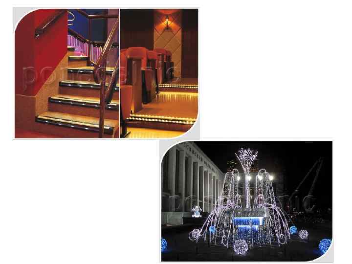 • Белт-лайт (belt light) - ременной шлейф из ПВХ или специальной водостойкой резины с фиксированным расстоянием между цоколями Е 27 для ламп мощностью 10 Вт. Также допустимо применение стробоскопических ламп и светодиодных ламп-хамелеонов. Данное изделие в комплекте с контроллером используется для создания эффекта «бегущих огней» . Белт-лайт предназначен для оформления освещения улиц, скверов, парков, мостов, объемных букв, вывесок, фасадов зданий. • Также идеален для оформления казино, баров, ресторанов, стадионов ит. д.