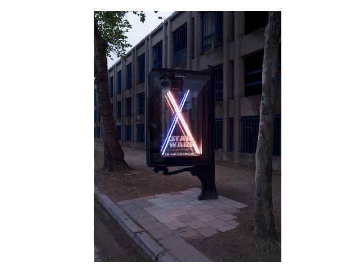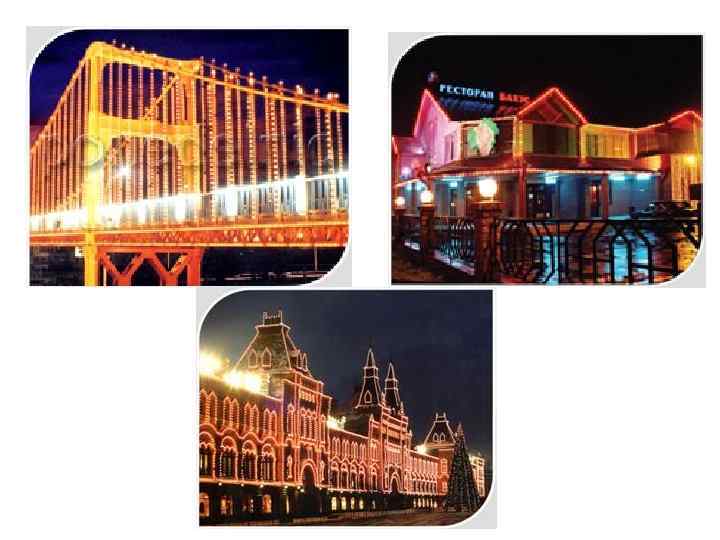 ДЕКОРАТИВНАЯ СВЕТОТЕХНИКА В НАРУЖНОЙ РЕКЛАМЕ • • Дюралайт (duralight) - гибкий световой шнур из поливинилхлорида (ПВХ), внутри которого помещены лампочки накаливания мощностью 0, 4 -0, 5 Вт или светодиоды. Дюралайт имеет защиту от УФ-излучения и высокий ресурс непрерывного свечения (от 25 000 ч). Диапазон температур для его применения очень широк (от -25°С до +60°С), при этом его эксплуатационные характеристики не изменяются в течение длительного времени. Поставляется бухтами по 90 -100 м. Для удобства монтажа и разных вариантов крепления предусмотрены различные комплектующие: муфты-невидимки и X-, L-, 3 D-, T-образные направляющие, заглушки, контакты, скобы, присоски для круглого и плоского дюралайта. Используется для декоративного оформления интерьеров и в наружной рекламе.