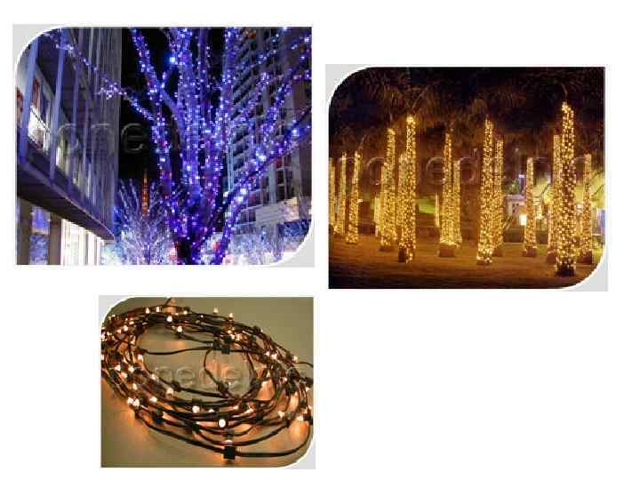• • • Клип-лайт (clip light) - низковольтовая световая гирлянда, разработанная специально для украшения деревьев и крупных кустарников с напряжением питания 24 В (подключается к сети 220 В через понижающий трансформатор). В этом изделии используются специальные лампы, способные долго работать в сложных погодных условиях. Выход одной лампы из строя не прекращает работу всей гирлянды. На российском рынке представлены гирлянды с расстоянием между лампами 75, 150, 300 мм. Также к клип-лайту предлагаются колпачки различных цветов (красный, желтый, синий, зеленый и прозрачный), использование которых позволяет защитить электрическую лампочку и изменить ее свет.