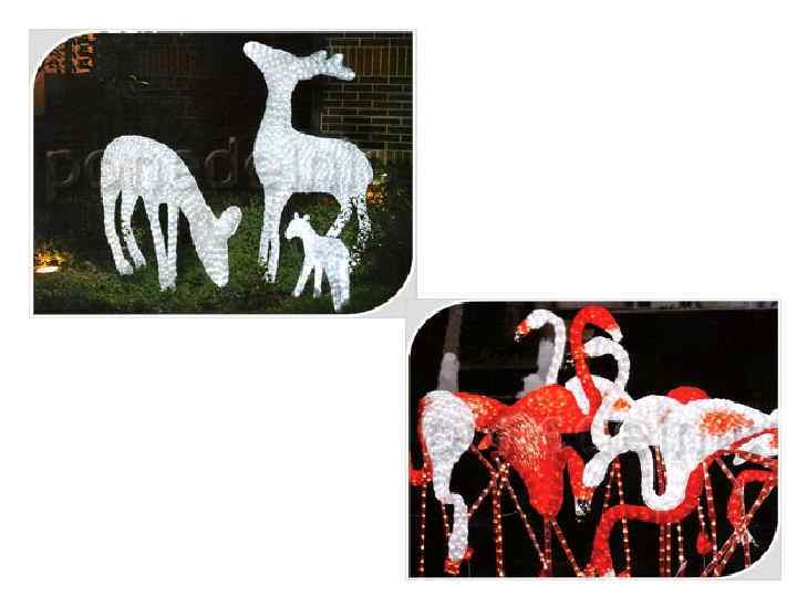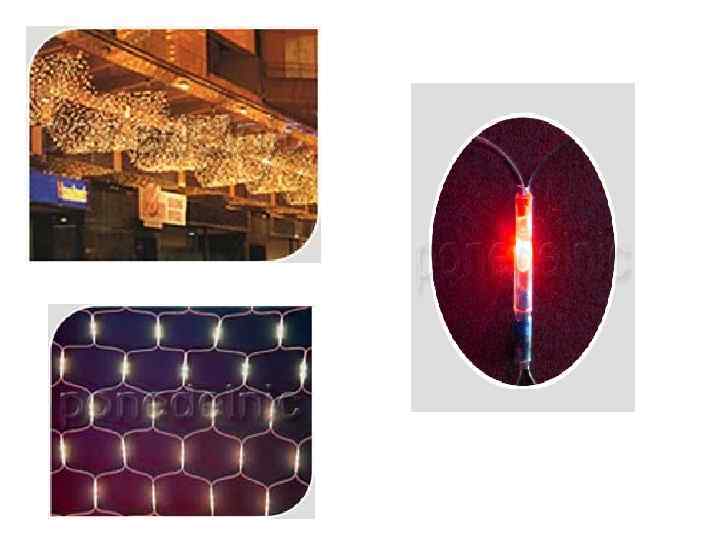 • • Световые сетки (sparkle net light, SNL) - световые декоративные сетки длительного срока службы (25 000 ч) для украшения интерьеров, зданий, парков и всевозможных рекламных проектов. Сетки выполнены из проводов ПВХ или прорезиненных кабелей, которые пересекаются и образуют ячейки в форме ромба. В точках пересечения располагаются одна или две лампы. Сетки могут быть прямоугольными разных размеров, треугольными (Т), круглыми (R) со статическим и динамическим (через контроллеры) режимами работы через понижающие трансформаторы от сети 220 В. Световые сетки можно оборачивать вокруг жесткого каркаса или натягивать между опорами.