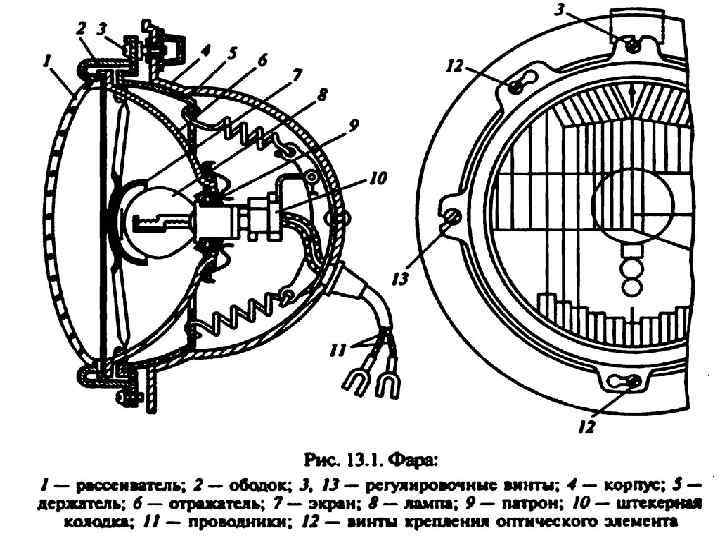 В конструкции фар предусмотрена регулировка направления их светового потока в горизонтальной и вертикальной плоскостях в пределах 4. . . 5* от исходного положения. Свет фар регулируют при помощи двух регулировочных винтов 3 и 13, которые, воздействуя на держатель 5, изменяют положение оптического элемента, закрепляемого на корпусе фары винтами 11.
