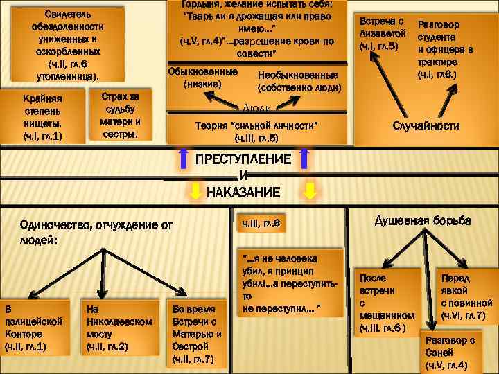 Свидетель обездоленности униженных и оскорбленных (ч. II, гл. 6 утопленница). Крайняя степень нищеты. (ч. I, гл. 1) Гордыня, желание испытать себя: “Тварь ли я дрожащая или право имею…” (ч. V, гл. 4)”…разрешение крови по совести” Обыкновенные (низкие) Страх за судьбу матери и сестры. Встреча с Лизаветой (ч. I, гл. 5) Необыкновенные (собственно люди) Разговор студента и офицера в трактире (ч. I, гл 6. ) Люди Теория “сильной личности” (ч. III, гл. 5) Случайности ПРЕСТУПЛЕНИЕ И НАКАЗАНИЕ ч. III, гл. 6 Одиночество, отчуждение от людей: В полицейской Конторе (ч. II, гл. 1) На Николаевском мосту (ч. II, гл. 2) Во время Встречи с Матерью и Сестрой (ч. II, гл. 7) “…я не человека убил, я принцип убил!. . . а переступитьто не переступил… ” Душевная борьба После встречи с мещанином (ч. III, гл. 6 ) Перед явкой с повинной (ч. VI, гл. 7) Разговор с Соней (ч. V, гл. 4)