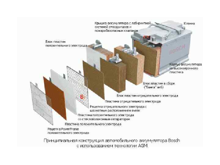 AGM аккумуляторы AGM (Absorbent Glass Mat) — это технология изготовления свинцово-кислотных аккумуляторов, созданная инженерами Gates Rubber Company в начале 1970 -х годов. Отличие батарей AGM - абсорбированный электролит, а не жидкий AGM - стекловолоконный пористый материал, из которого выполнен сепаратор, заполняющий пространство между пластинами аккумулятора. Сепаратор напитан, как губка, жидким электролитом (водным раствором серной кислоты). Такой конструкцией сепаратора достигается несколько целей: - высокое качество изоляции пластин; - усложняется выход за пределы капиллярной системы сепаратора газов, облегчается их рекомбинация с максимальной эффективностью (свыше 99% при нормальных условиях); - подвижность ионов в жидком электролите остается высокой, обеспечивая отличные динамические разрядные и зарядные характеристики; - легко обеспечивается ускоренный заряд величиной до 0, 3 С 10, а кратковременно – до 0, 5 С 10; - умеренные требования к качеству зарядного напряжения (стабильность, пульсации); - температурные неоднородности выравниваются благодаря подвижности жидкого электролита внутри стеклокапиллярного материала; - электролит связан в сепараторе благодаря капиллярным эффектам, не вытекает за пределы сепаратора, аккумуляторы могут эксплуатироваться в любом положении (кроме перевернутого); - стекловолоконный сепаратор дополнительно фиксирует активный материал пластин, предотвращая их осыпание из-за коррозии в процессе эксплуатации. Обеспечиваемые такой конструкцией и особенностью работы преимущества сделали аккумуляторы типа AGM одними из самых распространенных в мире.
