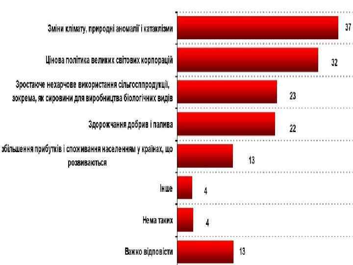 Наслідки для України Можливості q q Збільшення експорту с/г продуктів. Залучення інвестицій в АПК України Рекультивація земель Збільшення питамої вартості АПК в господарстві України Загрози q q q Зростання світ на світовому ринку має негативний вплив на внутрішній ринок України – зокрема, обмеження експорту зерна та зростання цін на продукти харчування, що завозяться Відсутність можливостей збільшення обсягів виробництва с/г продукції внаслідок пізнього введення земельної реформи (Земельний кадастр) Відсутність державної підтримки малих виробників і фактичне їх розорення