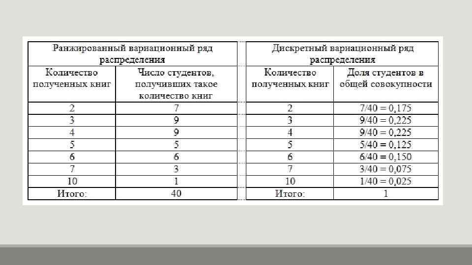 Дискретный вариационный ряд характеризует распределение единиц совокупности по дискретному признаку, принимающему только целые значения