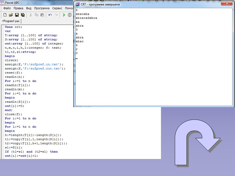 Для строковых величин определены следующие четыре стандартные функции: 1. Функция соединения - concat(sl,s2,...,sk). Значение функции - результат соединения строк sl ,s2,...sk, если он содержит не более 256 символов. 2. Функция выделения - copy(s,i,k). Из строки s выделяется k символов, начиная с i-того символа: а:=сору('крокодил',4,3); (в результате а='код’). 3. Функция определения длины строки - length(s). Вычисляется количество символов, составляющих текущее значение строки s: b:=length('каникулы'); (b=8). 4. Функция определения позиции - pos(s,t). Вычисляется номер позиции, начиная с которого строка s входит первый раз в строку t; результат равен 0, если строка s не входит в t: с:=роs('ом','компьютер'); (с=2). В Паскале определены также четыре стандартные процедуры для обработки строковых величин: 1. Процедура удаления delete(s,i,k). Из строки s удаляется k символов, начиная с i-того символа: s:='таракан'; delete(s,5,2); (в результате S='таран'). 2. Процедура вставки - insert(s,t,i). Строка s вставляется в строку t, начиная с позиции i: t:='таран'; insert ('ka',t,5); (t='таракан'). 3. Процедура преобразования числа в строку символов - str(k,s): str(564,s); (s='564'). 4. Процедура преобразования строки из цифр в число - val(s,k,i): val('780',k,i); (k=780; i=0). Операции над строками