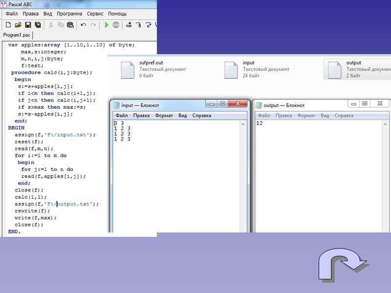 План прямоугольного сада размером mxn состоит из квадратных зон. В каждой зоне растёт по дереву. С каждого дерева любой зоны могут упасть несколько яблок. В левом верхнем квадратике находится ёжик, который должен дойти до правого нижнего квадратика. В саду существуют ограничения относительно способа передвижения: ёжик может двигаться из текущего квадратика только в один из двух соседних правый либо нижний. Составьте программу, которая вычисляет максимальное количество яблок, которое может собрать ёжик, передвигаясь к нужному квадратику. Технические условия: План сада задан таблицей apples содержащей m строк и n столбиков. Элемент apples[i,j] таблицы указывает количество яблок, упавших с дерева в зону с координатами i,j. Текстовый файл "input.txt" содержит в первой строке числа m,n разделённые пробелом. В каждой из следующих m строк содержится по n чисел apples[i,j] разделённых пробелами. Файл "output.txt" должен содержать одно натуральное число. Примеры входных и выходных файлов: Input.txt 3 3 1 2 3 1 2 3 1 2 3 Output.txt 12