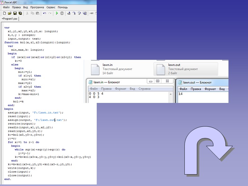Имя входного файла: lawn.in Имя выходного файла: lawn.out Максимальное время работы на одном тесте: 2 секунды Максимальный объем используемой памяти: 64 мегабайта Фермер Иван с юности следит за своим газоном. Газон можно считать плоскостью, на которой в каждой точке с целыми координатами растет один пучок травы. В одно из воскресений Иван воспользовался газонокосилкой и постриг некоторый прямоугольный участок газона. Стороны этого участка параллельны осям координат, а две противоположные вершины расположены в точках (x1, y1) и (x2, y2). Следует отметить, что пучки травы, находящиеся на границе этого прямоугольника, также были пострижены. Довольный результатом Иван купил и установил на газоне дождевальную установку. Она была размещена в точке с координатами (x3, y3) и имела радиус действия струи r. Таким образом, установка начала поливать все пучки, расстояние от которых до точки (x3, y3) не превышало r. Все было хорошо, но Ивана заинтересовал следующий вопрос: сколько пучков травы оказалось и пострижено, и полито в это воскресенье? Требуется написать программу, которая позволит дать ответ на вопрос Ивана. Формат входных данных В первой строке входного файла содержатся четыре целых числа x1, y1, x2, y2 (−100 000 ≤ x1 < x2 ≤ 100 000; −100 000 ≤ y1 < y2 ≤ 100 000). Во второй строке входного файла содержатся три целых числа x3, y3, r (−100 000 ≤ x3, y3 ≤ 100 000; 1 ≤ r ≤ 100 000) Формат выходных данных В выходной файл необходимо вывести одно целое число — число пучков травы, которые были и пострижены, и политы. Пример входных и выходных данных