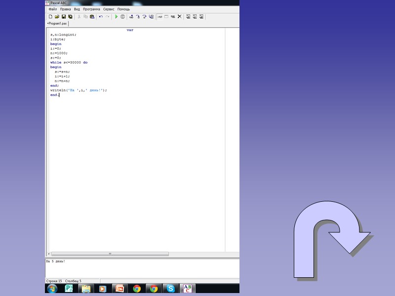 Условие: Хлестакова приглашали управлять департаментом. В первый день ему прислали 1000 курьеров, а в каждый следующий - в 2 раза больше, чем в предыдущий. Хлестаков согласился, когда прислали 30000 курьеров. На какой день это произошло? (Учесть, что Хлестаков слаб в умножении и делении).