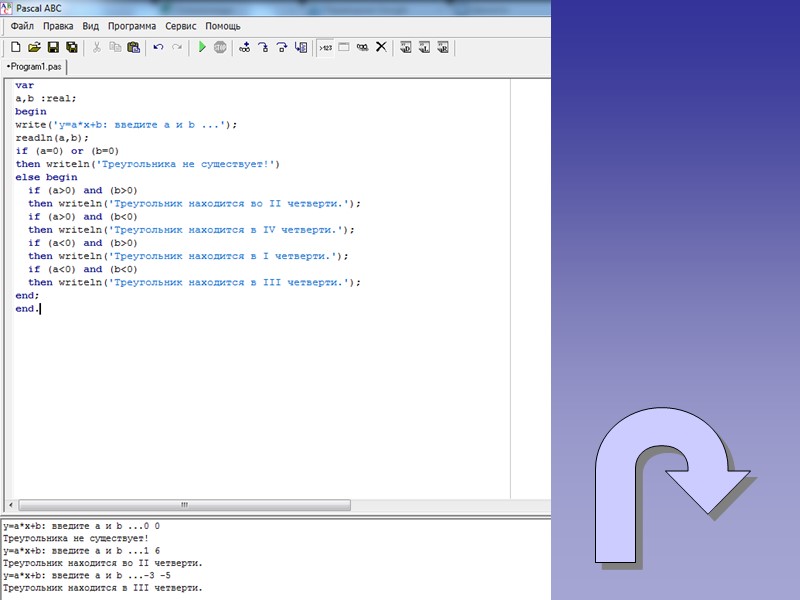 Условие: Вычислите, в какой координатной четверти расположен треугольник, образованный прямой, заданной уравнением y=ax+b, и осями координат. Решение: Если в уравнении прямой первый коэффициент положительный, то прямая лежит либо во второй, либо в четвертой четверти, при этом если свободный член положительный, то во второй, а если отрицательный- то в четвертой. Значит там же находится и весь треугольник, так как он образован этой прямой и осями координат. Аналогично рассуждаем и для отрицательного углового коэффициента: при положительном свободном члене - первая четверть, а при отрицательном - третья.