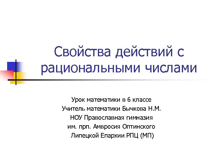 Свойства действий с рациональными числами Урок математики в 6 классе Учитель математики Бычкова Н. М. НОУ Православная гимназия им. прп. Амвросия Оптинского Липецкой Епархии РПЦ (МП)