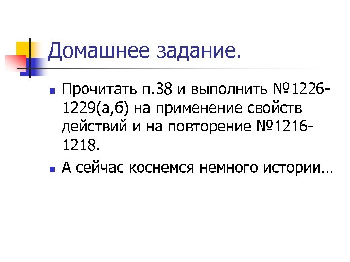 Домашнее задание. n n Прочитать п. 38 и выполнить № 12261229(а, б) на применение свойств действий и на повторение № 12161218. А сейчас коснемся немного истории…