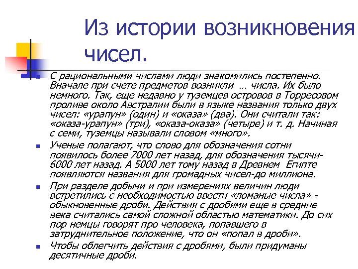 Из истории возникновения чисел. n n С рациональными числами люди знакомились постепенно. Вначале при счете предметов возникли … числа. Их было немного. Так, еще недавно у туземцев островов в Торресовом проливе около Австралии были в языке названия только двух чисел: «урапун» (один) и «оказа» (два). Они считали так: «оказа-урапун» (три), «оказа-оказа» (четыре) и т. д. Начиная с семи, туземцы называли словом «много» . Ученые полагают, что слово для обозначения сотни появилось более 7000 лет назад, для обозначения тысячи 6000 лет назад. А 5000 лет тому назад в Древнем Египте появляются названия для громадных чисел-до миллиона. При разделе добычи и при измерениях величин люди встретились с необходимостью ввести «ломаные числа» обыкновенные дроби. Действия с дробями еще в средние века считались самой сложной областью математики. До сих пор немцы говорят про человека, попавшего в затруднительное положение, что он «попал в дроби» . Чтобы облегчить действия с дробями, были придуманы десятичные дроби.
