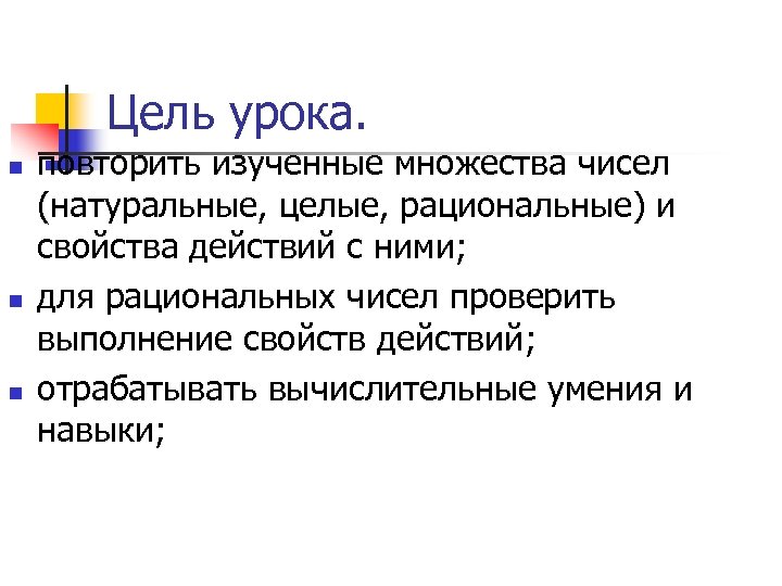 Цель урока. n n n повторить изученные множества чисел (натуральные, целые, рациональные) и свойства действий с ними; для рациональных чисел проверить выполнение свойств действий; отрабатывать вычислительные умения и навыки;