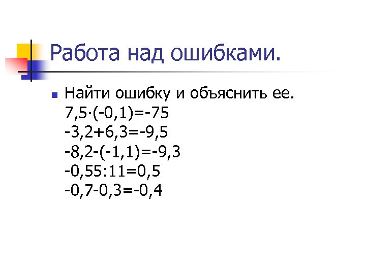 Работа над ошибками. n Найти ошибку и объяснить ее. 7, 5∙(-0, 1)=-75 -3, 2+6, 3=-9, 5 -8, 2 -(-1, 1)=-9, 3 -0, 55: 11=0, 5 -0, 7 -0, 3=-0, 4