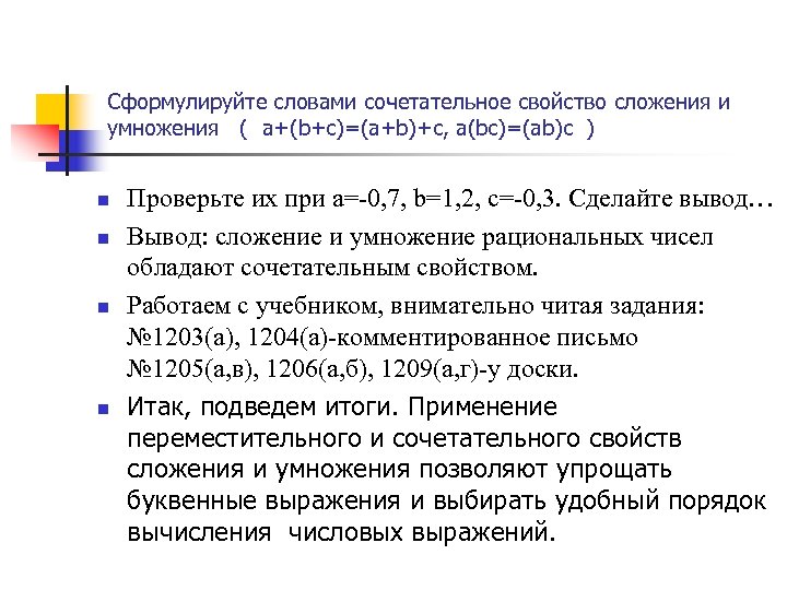 Сформулируйте словами сочетательное свойство сложения и умножения ( a+(b+c)=(a+b)+c, a(bc)=(ab)c ) n n Проверьте их при a=-0, 7, b=1, 2, c=-0, 3. Сделайте вывод… Вывод: сложение и умножение рациональных чисел обладают сочетательным свойством. Работаем с учебником, внимательно читая задания: № 1203(а), 1204(а)-комментированное письмо № 1205(а, в), 1206(а, б), 1209(а, г)-у доски. Итак, подведем итоги. Применение переместительного и сочетательного свойств сложения и умножения позволяют упрощать буквенные выражения и выбирать удобный порядок вычисления числовых выражений.