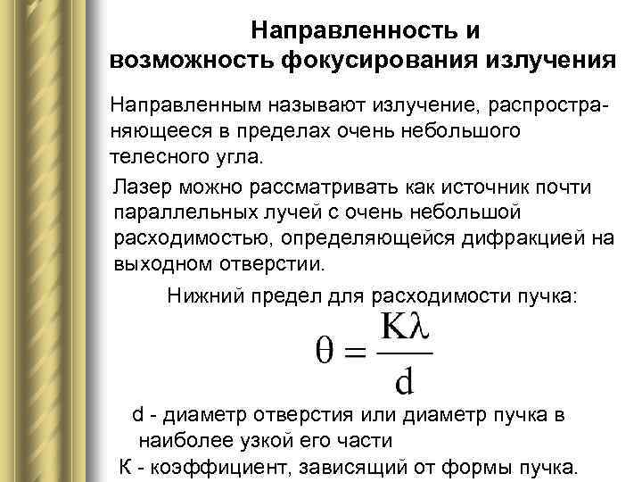 Направленность и возможность фокусирования излучения Направленным называют излучение, распространяющееся в пределах очень небольшого телесного угла. Лазер можно рассматривать как источник почти параллельных лучей с очень небольшой расходимостью, определяющейся дифракцией на выходном отверстии. Нижний предел для расходимости пучка: d - диаметр отверстия или диаметр пучка в наиболее узкой его части К - коэффициент, зависящий от формы пучка.
