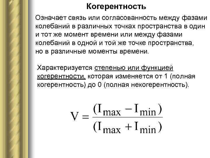 Когерентность Означает связь или согласованность между фазами колебаний в различных точках пространства в один и тот же момент времени или между фазами колебаний в одной и той же точке пространства, но в различные моменты времени. Характеризуется степенью или функцией когерентности, которая изменяется от 1 (полная когерентность) до 0 (полная некогерентность).