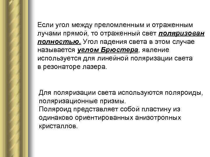 Если угол между преломленным и отраженным лучами прямой, то отраженный свет поляризован полностью. Угол падения света в этом случае называется углом Брюстера, явление используется для линейной поляризации света в резонаторе лазера. Для поляризации света используются поляроиды, поляризационные призмы. Поляроид представляет собой пластину из одинаково ориентированных анизотропных кристаллов.