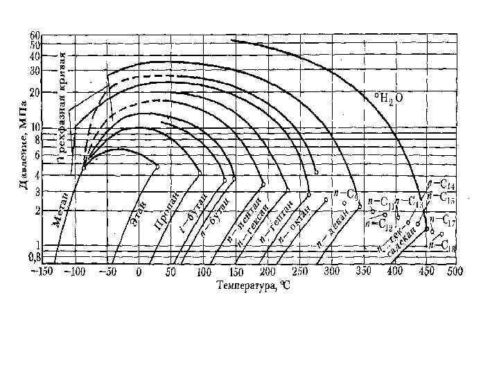 Зависимость критического давления от температуры для двойных смесей метана и нормальных парафиновых углеводородов. 23