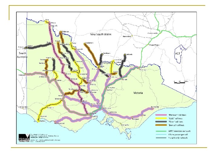 Recommendations – Rail Network – “Use it or Lose it” n ………the colour ranking… n Platinum – ARTC I/S; V/Line; Auslink n Gold – priority 1 for rehab to Class 4 or 5 (>50 -60 kmh) n Silver – priority 2 for rehab sub. to private commitment ‘above rail’ n Bronze – basic maintenance / Canadian model – local mgt.
