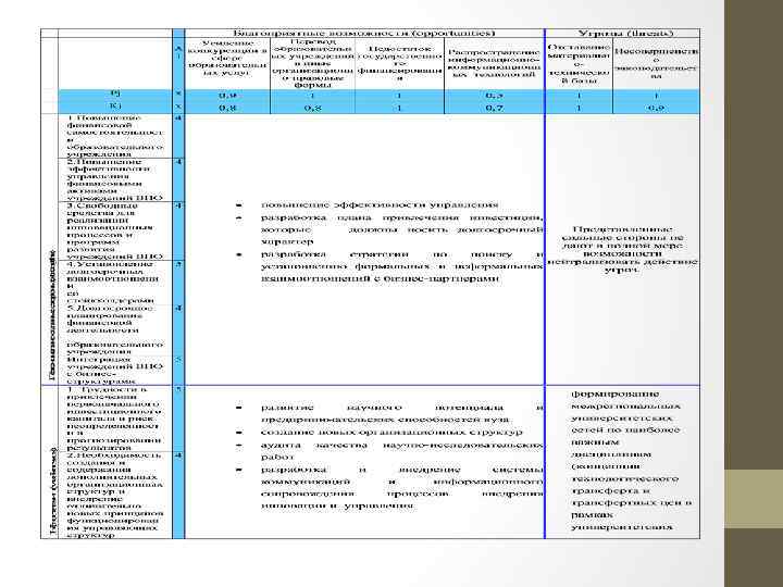 3. Идентификация благоприятных тенденций внешней среды Определим тенденции внешней среды, которые, являются благоприятными для реализации концепции технологического трансферта и Оценим вероятность появления конкретных благоприятных возможностей и их степень влияния на внедрение инноваций. Данные представим в виде таблицы, где: Рj - вероятность появления конкретных благоприятных возможностей (в пределах от 0 до 1); Kj - коэффициент влияния на ситуацию внедрения инноваций конкретных благоприятных возможностей оценка 0 - никак не влияет на ситуацию внедрения инноваций оценка 1 - создает коренные новые возможности промежуточные случаи: 0, 1 – 0, 3 - слабое влияние 0, 4 – 0, 6 - среднее влияние 0, 7 – 0, 9 - сильное влияние Благоприятные возможности Рj Kj Повышение эффективности управления образовательными учреждениями за счет их перевода в организационно-правовые формы, характерные для хозяйствующих субъектов 1 0, 8 Распространение информационно-коммуникационных технологий 0, 7 Недостаток государственного финансирования 0, 5 1 Усиление конкуренции в сфере образовательных услуг 0, 9 0, 8 Угроза обострения демографической ситуации 0, 8 0, 3 1