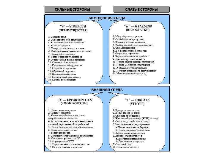 SWOT-анализ — метод стратегического планирования, используемый для оценки факторов и явлений, влияющих на проект или предприятие. Все факторы делятся на четыре категории: • сильные стороны; • слабые стороны; • возможности; • угрозы.
