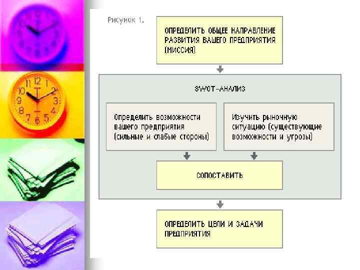 n n SWOT-анализ — это промежуточное звено между формулированием миссии вашего предприятия и определением его целей и задач. Вы определили основное направление развитие своего бизнеса (его миссию) Затем вы взвешиваете свои силы и оцениваете рыночную ситуацию, чтобы понять, сможете ли вы двигаться в указанном направлении и каким образом это лучше сделать (SWOT-анализ); После этого вы ставите перед своей организацией цели, учитывая ее реальные возможности (определение стратегических целей).