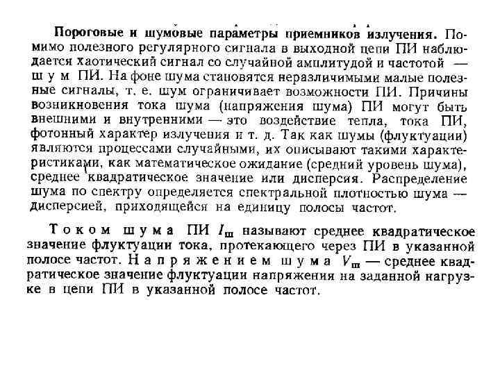 Пороговая чувствительность – минимальный поток излучения, который может быть обнаружен на фоне собственных шумов т. е. : минимальный поток излучения, вызывающий на выходе приёмника сигнал, равный напряжению собственных шумов или превышающий их в кратное число раз. Шумами называют хаотичные сигналы со случайными амплитудами и частотами, возникающими в цепи включения приёмника при отсутствии измеряемого потока излучения. Т. к. мощность шумов приёмника зависит от площади чувствительной площадки приёмника и существенна в полосе частот усилителя сигнала, то для сравнения различных приёмников служит пороговая величина потока излучения, отнесённая к единичной полосе пропускания (1 Гц), единичной площади и измеряемая в Вт/Гц. На практике используют обратную величину, называемую обнаружительной способностью. Эта характеристика, будучи независимой от размера чувствительной площадки, удобна для сравнения различных типов приёмников.